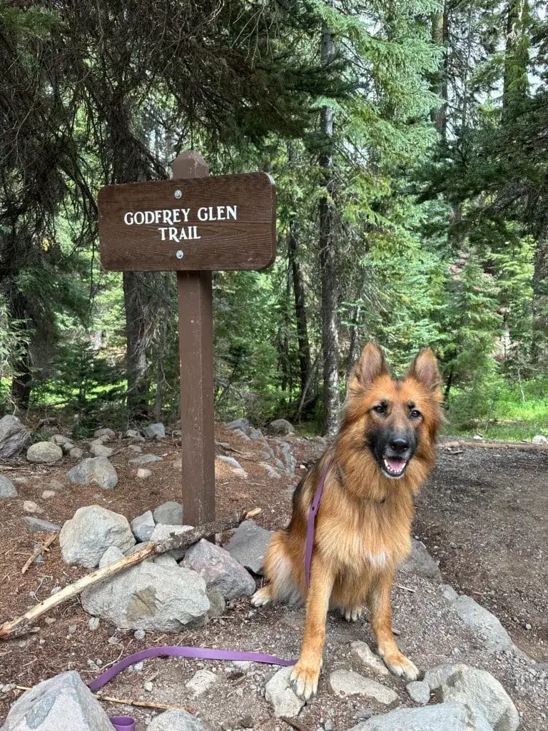 Not every trail is open to pets, but you do have some solid options. The Lady of the Woods Trail and Godfrey Glen Trail both allow leashed dogs. So does Grayback Drive and the Pacific Crest Trail, as long as you skip the alternate rim route. source